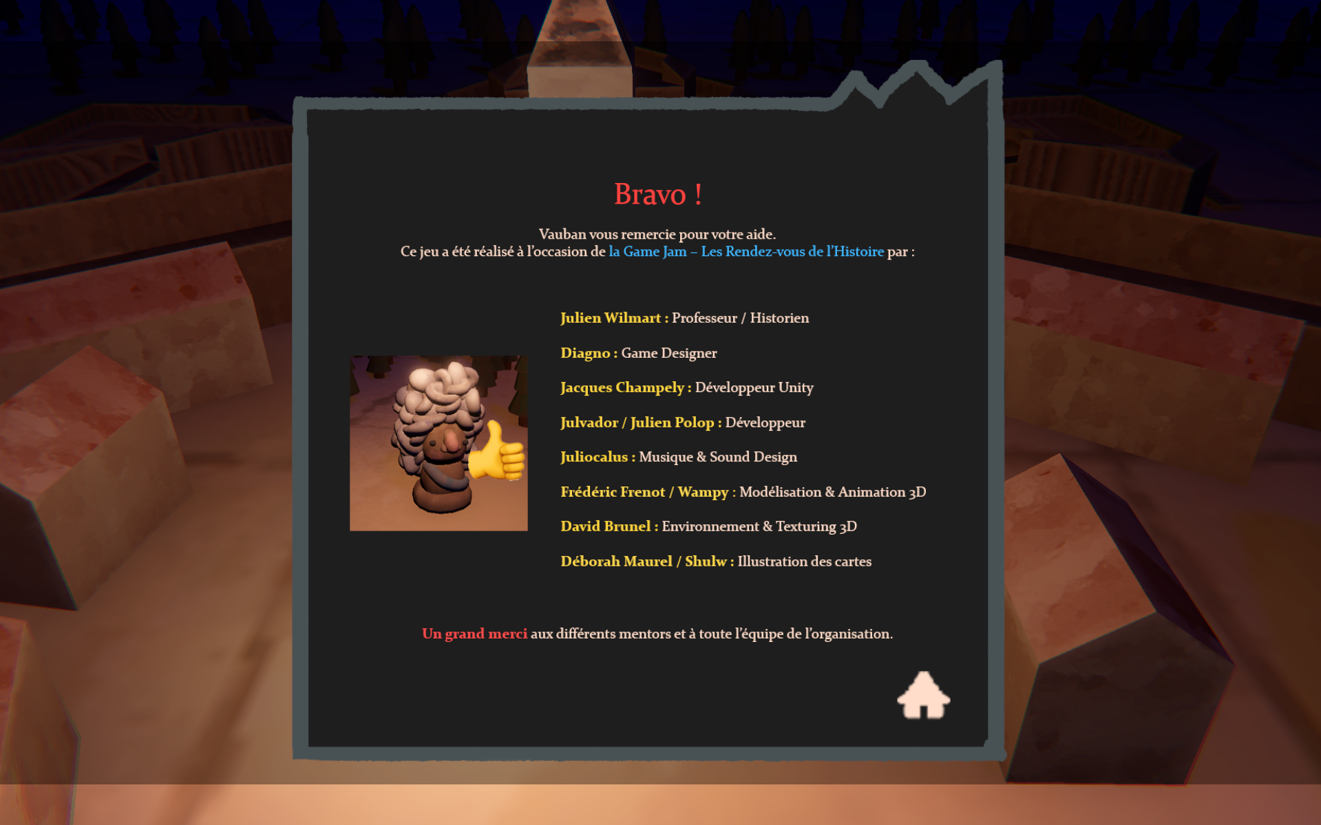 Haha, j’adore notre petit Vauban aussi x) ! Content que tu aies apprécié le jeu. Évidemment, le concept reste encore à améliorer, avec le temps limité et l’absence de certains développeurs, il nous a été très compliqué d’augmenter le scope